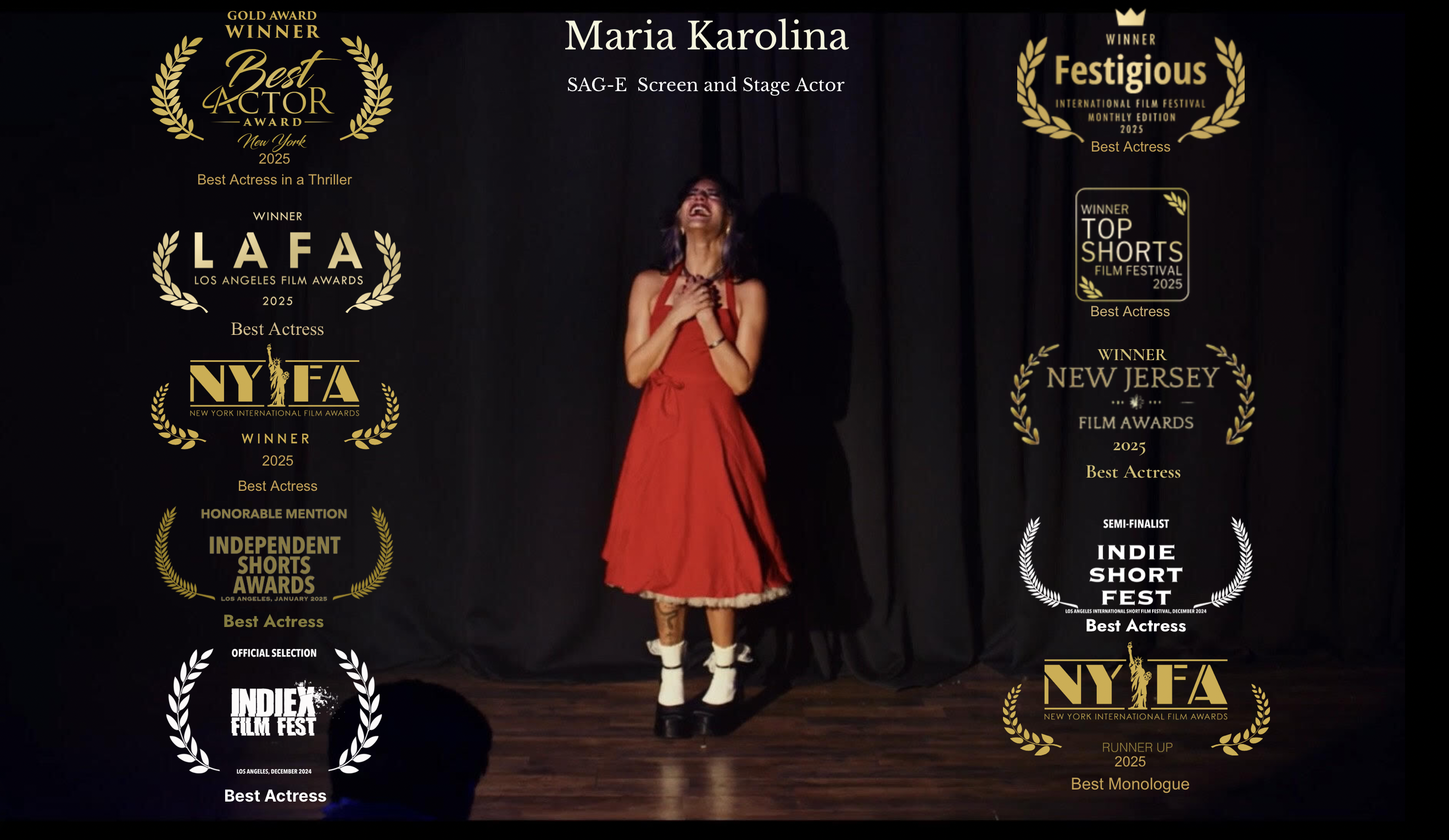 Maria Karolina is a bilingual award winning Venezuelan actress and acting teacher based in NYC. Maria began acting when she was 6 years old in annual plays held in her hometown- Miami, FL. By the time Maria was 17, she had won several awards for provocative speeches targeting social issues, competing at institutions such as Harvard University for 3 years straight. That's where she learned how impactful and moving storytelling can be, and from there, she made the decision to pursue acting in the name of art and social activism.From there she has worked consistently and dedicatedly on a plethora of films, winning her several best actress awards at film festivals internationally in 2025.