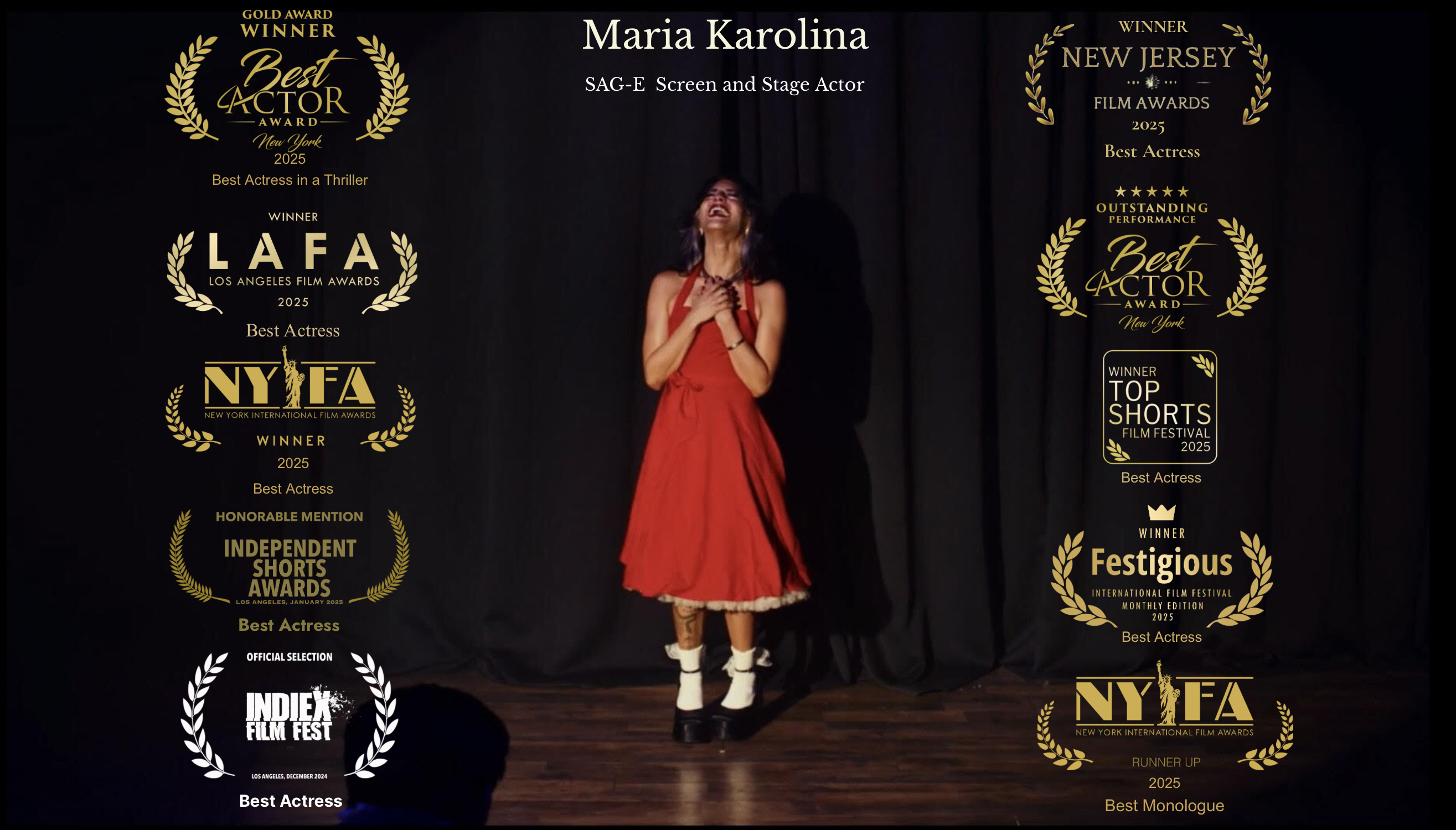 Maria Karolina is a bilingual Venezuelan actress and acting teacher based in NYC. Maria began acting when she was 6 years old in annual plays held in her hometown- Miami, FL. By the time Maria was 17, she had won several awards for provocative speeches targeting social issues, competing at institutions such as Harvard University for 3 years straight. That's where she learned how impactful and moving storytelling can be, and from there, she made the decision to pursue acting in the name of art and social activism. From there she has worked consistently and dedicatedly on a plethora of films, winning her several best actress awards at film festivals internationally in 2025.